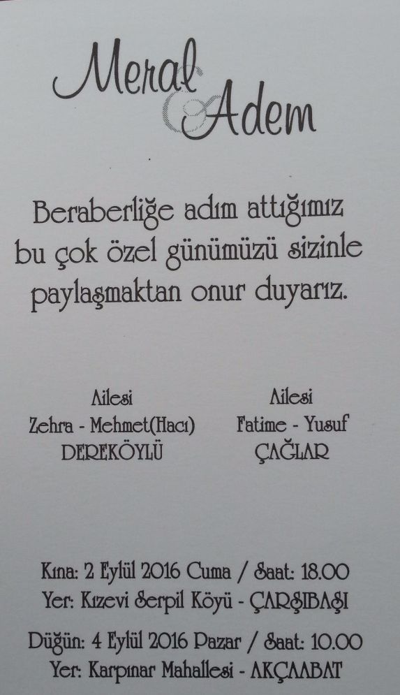 Düğün 4 Eylül 2016 Pazar Saat 10:00 Karpınar Mahallesi AKÇAABAT