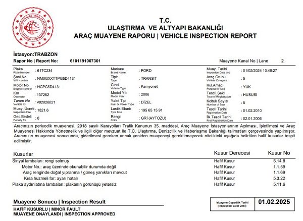 Araba muayene geçerlilik tarihi: 01.02.2025 KM: 137282