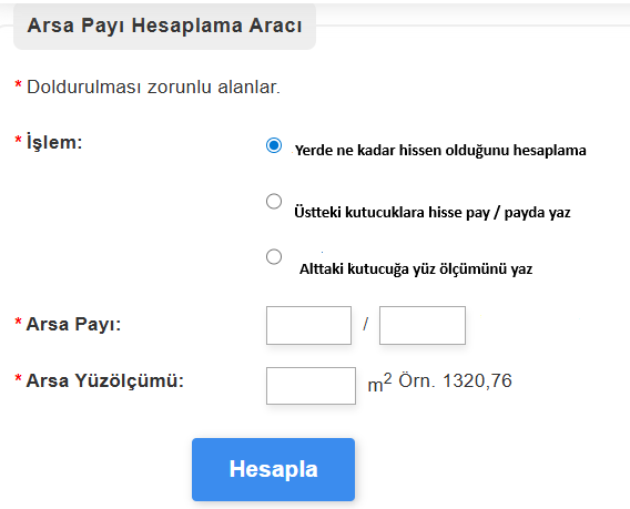 Hisseli tapulu arazilerde kaç metre kare yerimizin olduğunu öğrenmek çok basit aşağıdaki hesaplama aracına tapumuzda yazan hisse pay / hisse payda değerlerimizi giriyoruz altta kutucuğa arazinin toplam yüz ölçümünü yazıyoruz hesapla tuşuna tıklıyoruz arazide kaç metre kare yerimizin olduğunu öğreniyoruz.