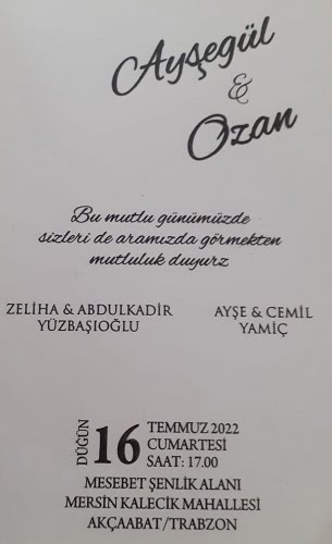 Zeliha & Abdulkadir çiftinin kızları Ayşegül YÜZBAŞIOĞLU ile Akçaabat Mersin mahallesinden Ayşe & Cemil çiftinin oğulları Ozan YAMİÇ evleniyorlar.