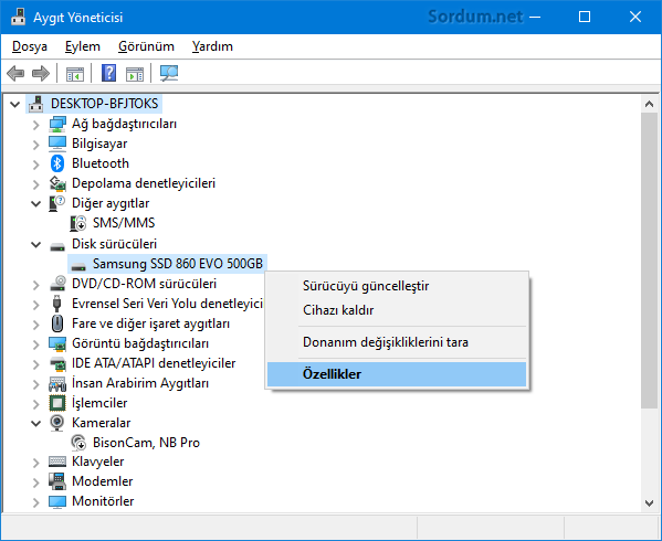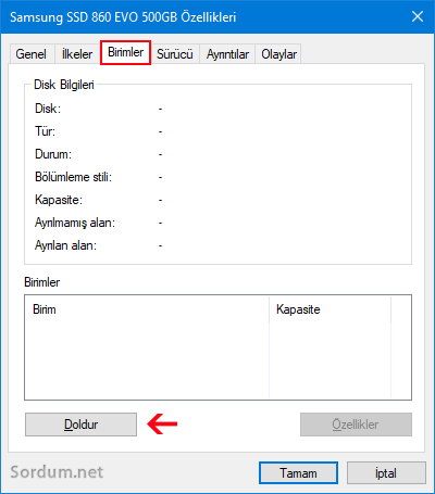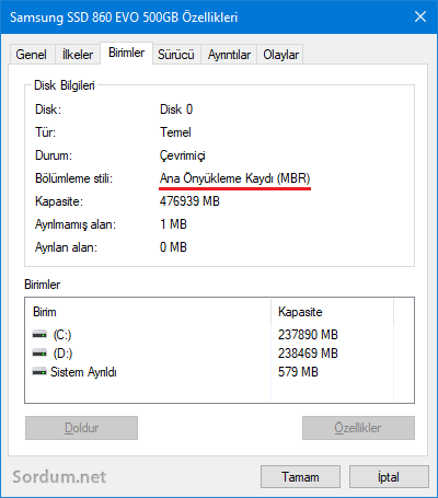Aygıt yöneticisinden, Diskimizin MBR mi GPT mi olduğunu bulabiliriz.