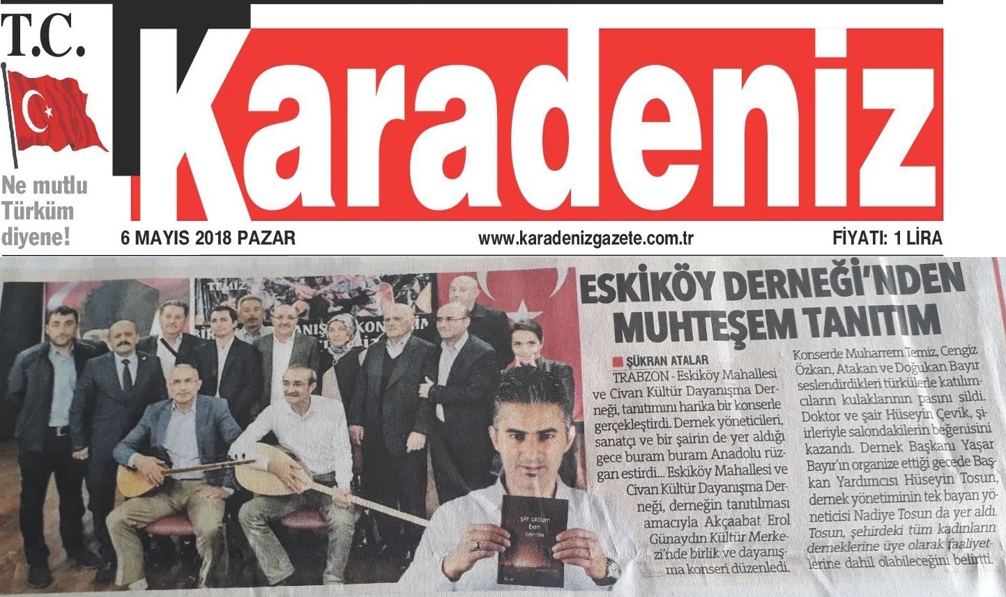 Akçaabat Eskiköy Mahallesi ve Civarı Kültür Dayanışma Derneğinin 28.04.2018 tarihinde düzenlediği Muharrem TEMİZ ve Cengiz ÖZKAN’ın birlikte sahne aldığı Birlik ve Dayanışma Konserine dair Karadeniz Gazetesinde Şükran ATALAR imzalı haber-yorum yayınlandı.