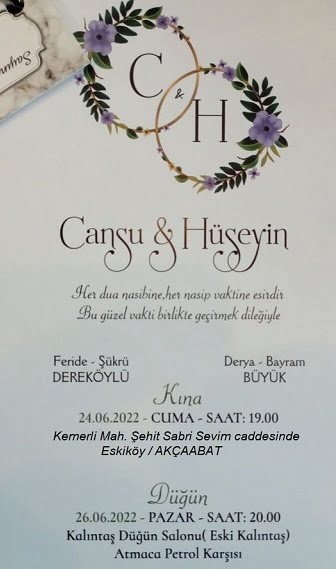 Çarşıbaşı Serpil köyünden Feride & Şükrü çiftinin kızları Cansu DEREKÖYLÜ ile Akçaabat Eskiköy mahallesinden Derya & Bayram çiftinin oğlu Hüseyin BÜYÜK hayatlarını birleştiriyor.