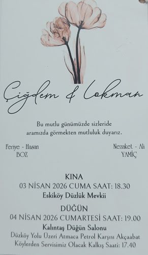 Akçaabat Eskiköy mahallesinden Feriye & Hasan BOZ çiftinin kızları Çiğdem Boz ile Akçaabat Mersin mahallesinden Nezaket & Ali YAMİÇ çiftinin oğulları Lokman Yamiç evleniyorlar. “Bu mutlu günlerimizde sizleri de aramızda görmekten mutluluk duyarız” diyorlar.