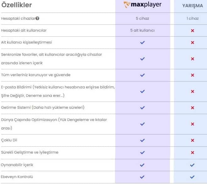 MaxPlayer piyasadaki en iyi çözüm diğer uygulamalarla karşılaştırma aşağıda