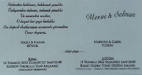 Akçaabat Eskiköy mahallesinden Nazlı & Hasan çiftinin kızları Merve BÖYÜK ile Makbule & Cafer çiftinin oğulları Selman TOSUN evleniyor.