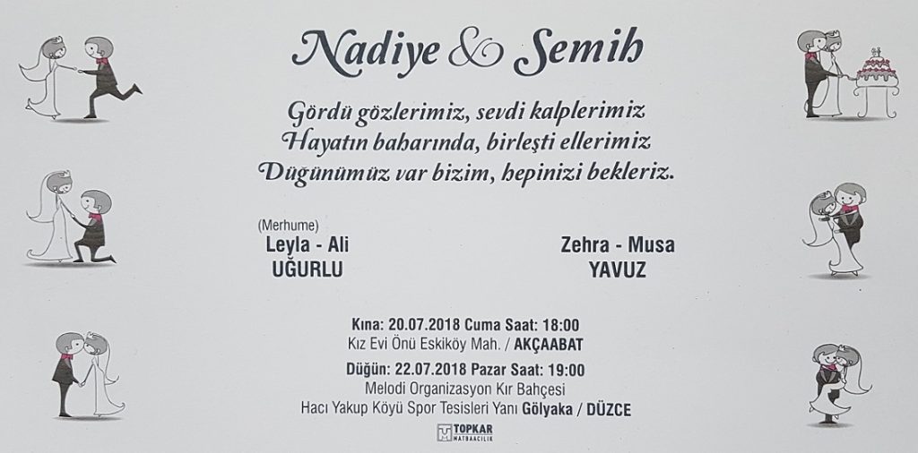 KINA DÜĞÜNÜ: 20 Temmuz 2018 Cuma Saat 18:00’de Akçaabat Eskiköy Mahallesi Kız evi önünde