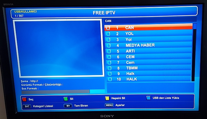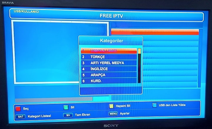 Free IPTV tıklayınca açılan USB/KULLANICI bölümüne geliyoruz dosyamızı yüklüyoruz. Daha sonra kumandamızdaki SAT tuşu ile kategorileri görebiliyoruz
