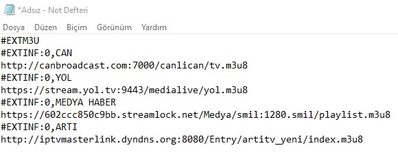 Bilgisayarımızda hazırladığımız Not Defteri uygulamasında yukarıdaki örnekte olduğu gibi dosyamızı hazırlıyor m3u olarak kayıt ediyoruz